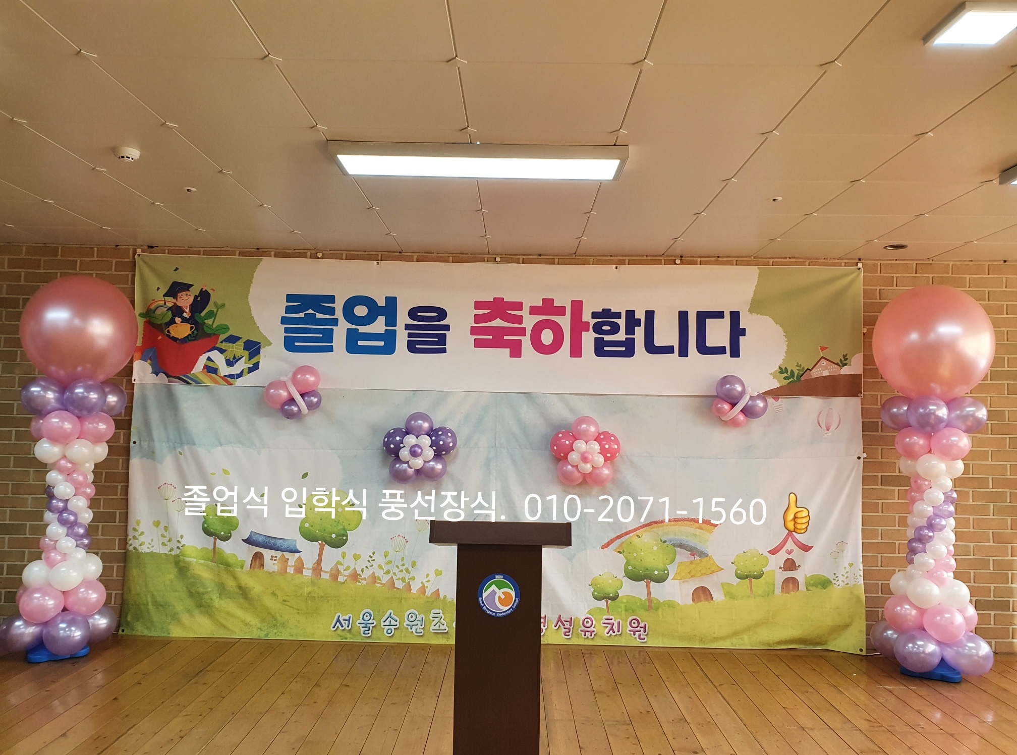 무대 양쪽에 풍선기둥을 세우고 무대단을 꾸민 후. 무대 뒤쪽과 옆쪽 벽면을 장식하기도 합니다