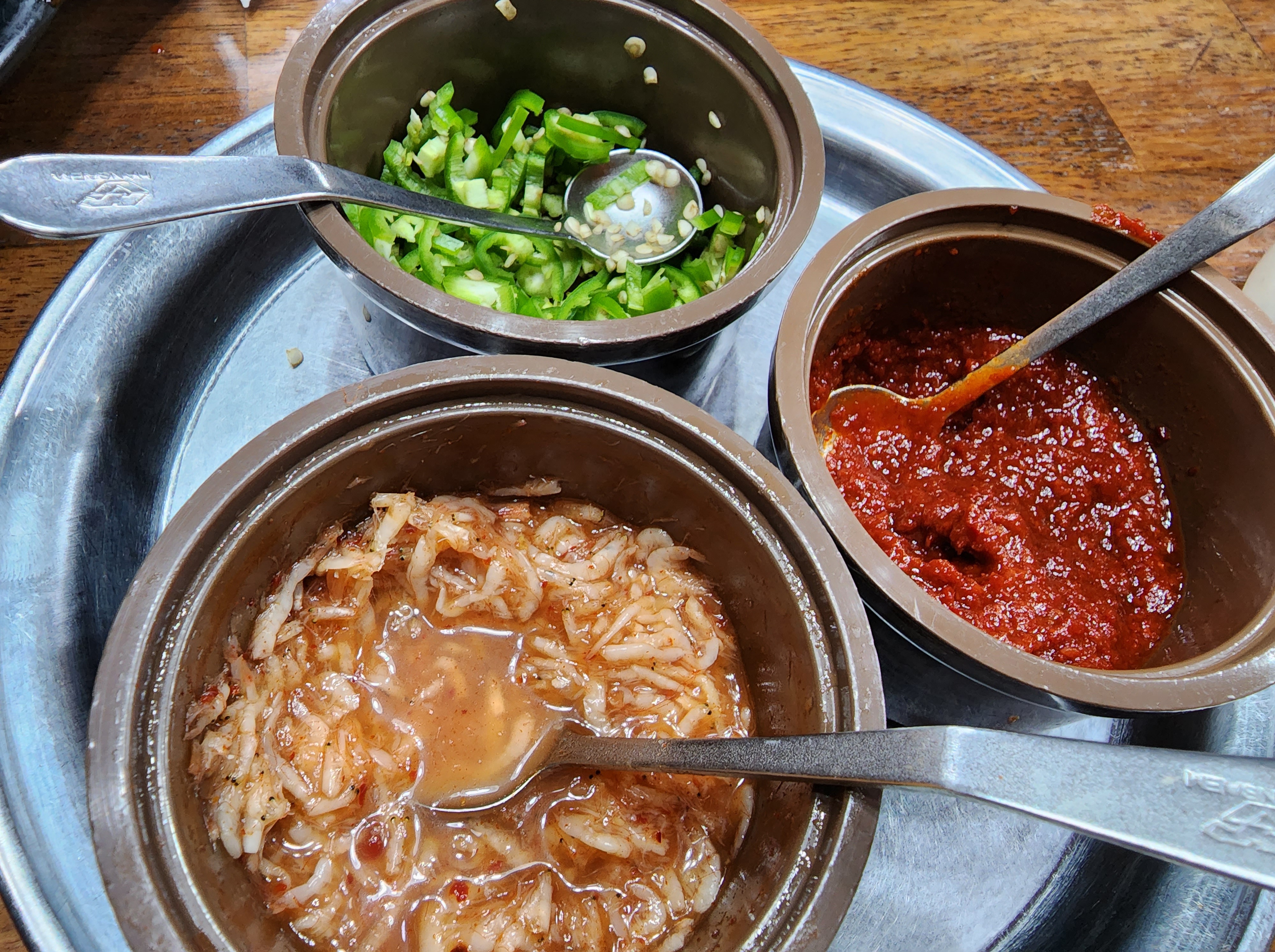새우젓, 다진 고추, 다대기, 들깨가루를 취향껏 넣은 후, 뚝배기 가득 공기밥을 하나 가득 넣어서 김치랑 깍두기를 얹어서 먹는 맛은 감동 그 자체였어요