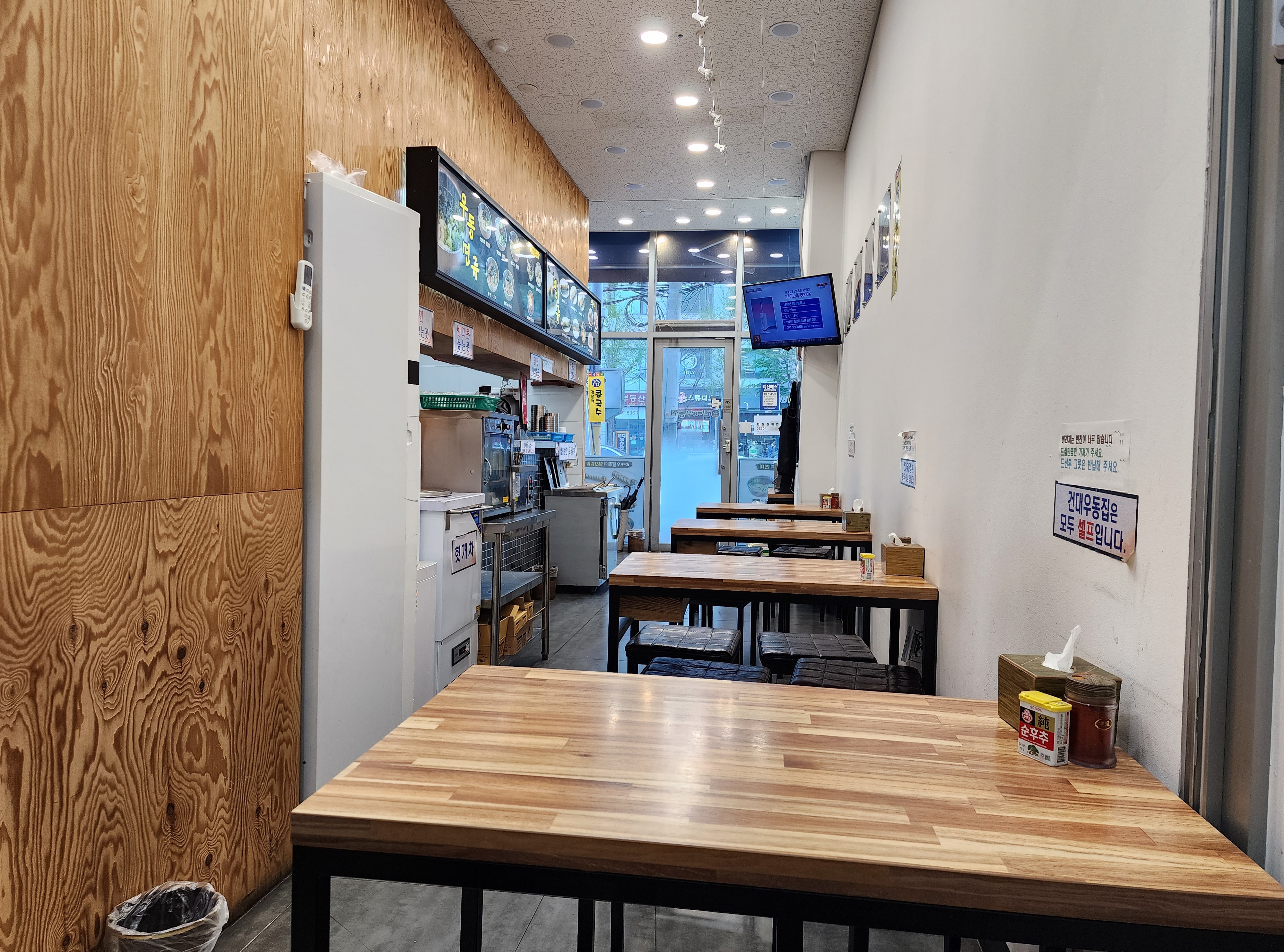 마주보고 앉아서 먹을 수 있는 테이블이 5개 정도이고, 혼밥하는 사람들을 위한 테이블도 문입구 쪽에 있어요