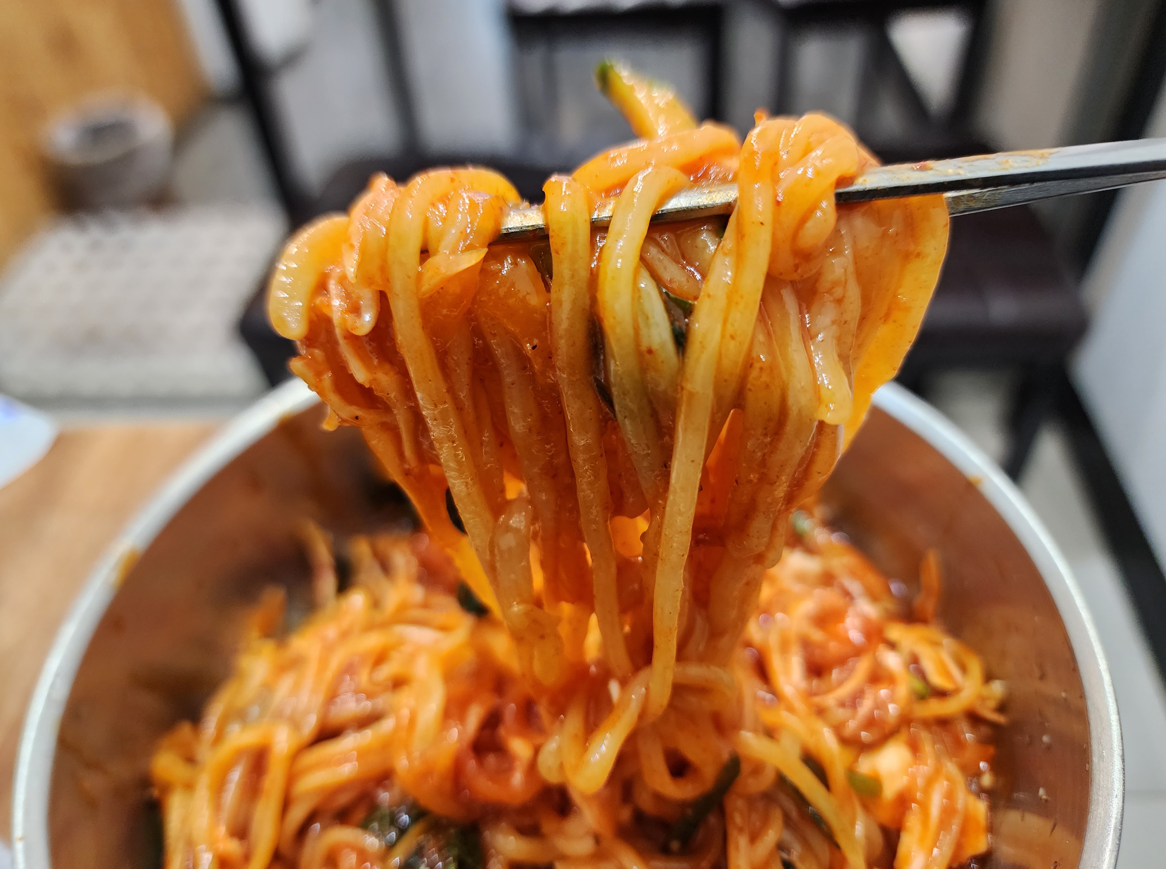 양념에 채소들이 고르게 들어가 있어서 쫄면의 쫄깃식감과 어우러져서 아삭아삭 씹혀요