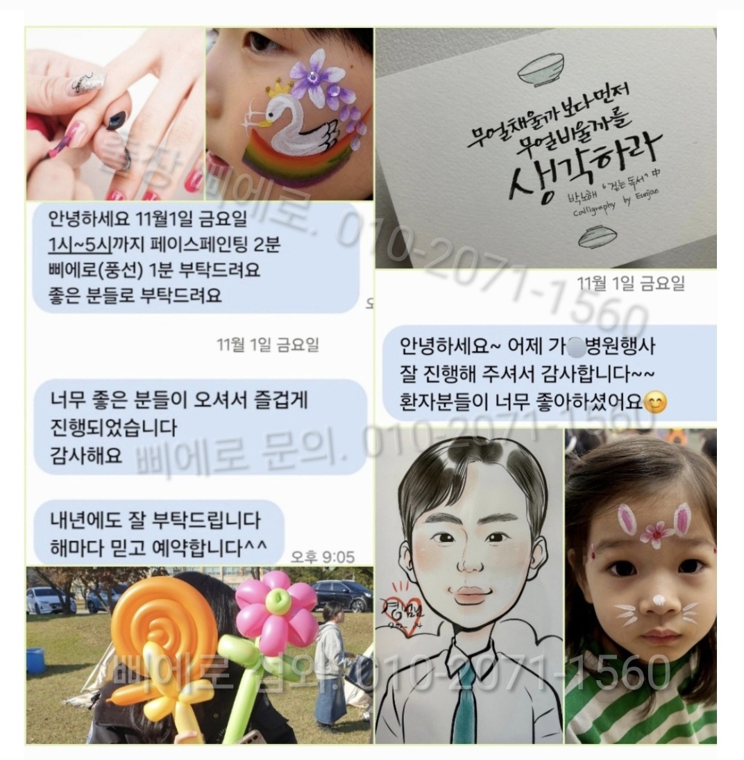 삐에로 요술풍선행사! 페이스페인팅/ 캐리커쳐/ 캘리그라피/ 네일아트/ 헤나 모두 잘하는 곳 (0) | 2025.01.06 |